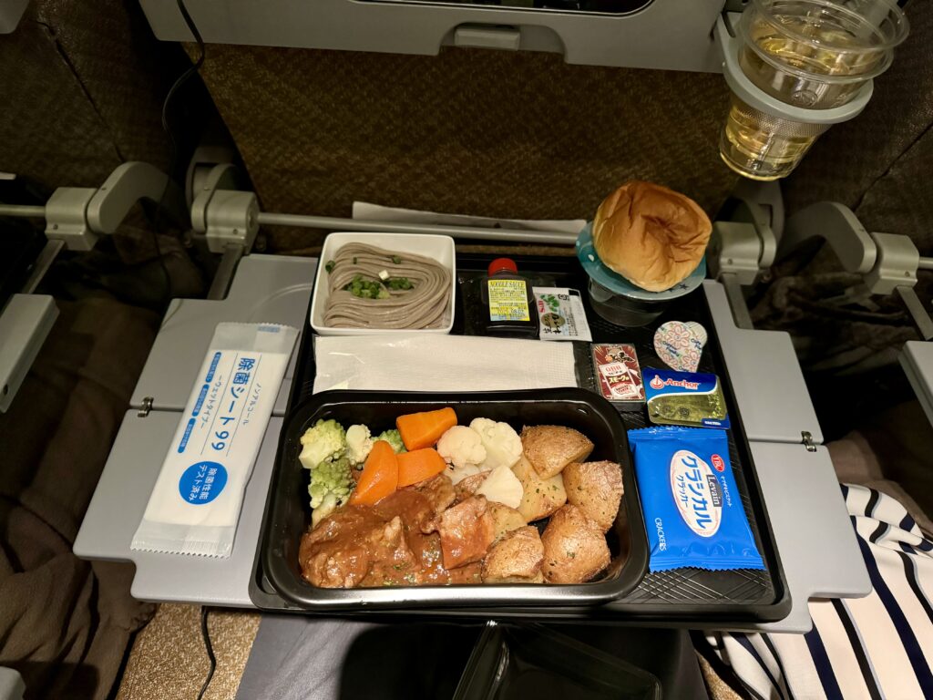 夜はチキンかビーフでビーフを選びました。デザートはなんとハーゲンダッツです!