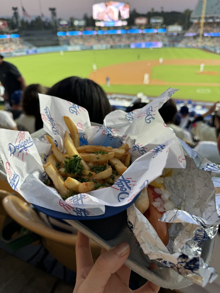 ドジャースタジアムは本当に鮮やかで綺麗です!スタジアムは広いし、飲食店も見るところもたくさんあって、試合までの2時間ではとても回りきれなかったです。画像上の選手と一緒に写真が撮れる、ARフォトブースはかなり長蛇の列で、諦めてスタジアム内を散策しました。でも雰囲気でもう最高です!ヘルメットのポテトとドジャースドッグ買って席へ。ガーリック味のポテトすごく美味しかったです!